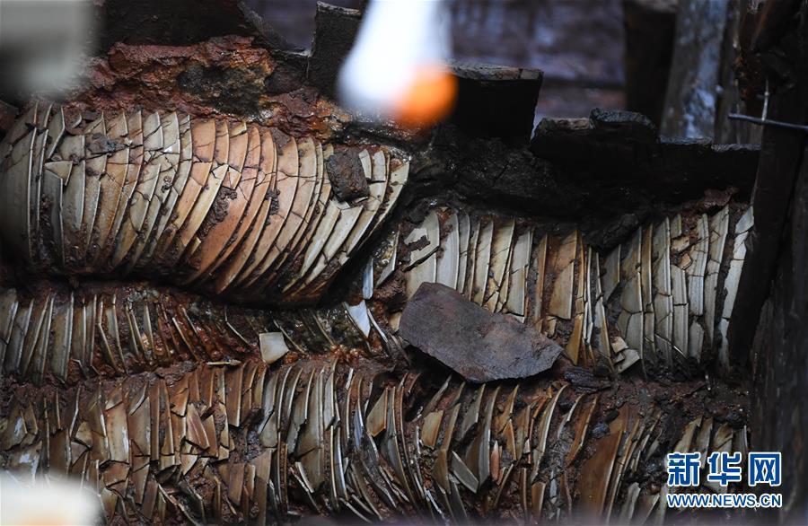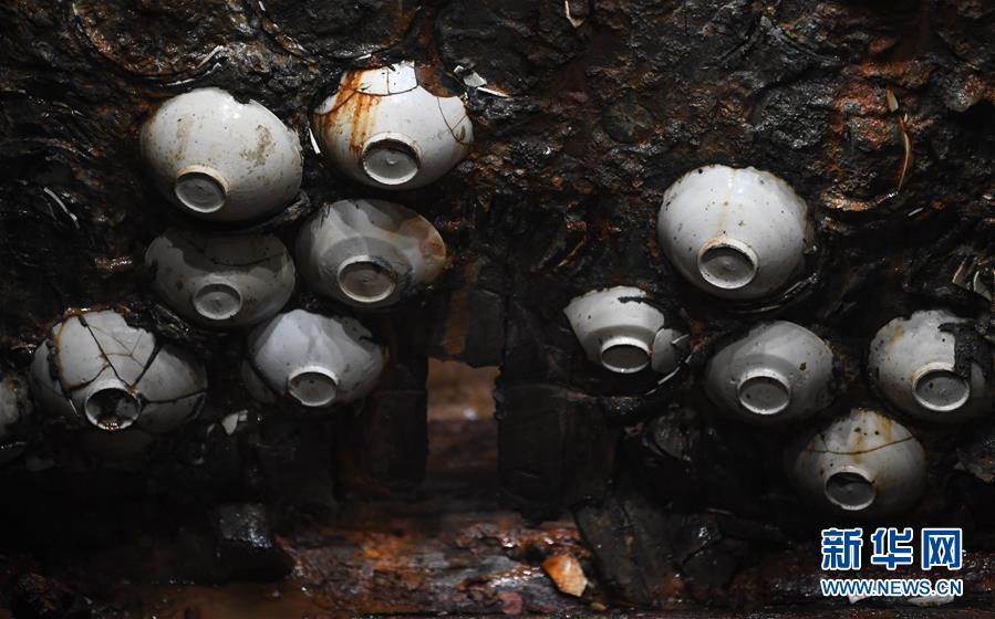 这是在广东阳江海陵岛拍摄的“南海I号”船体上嵌入的瓷器(5月12日摄)。新华社记者 邓华 摄