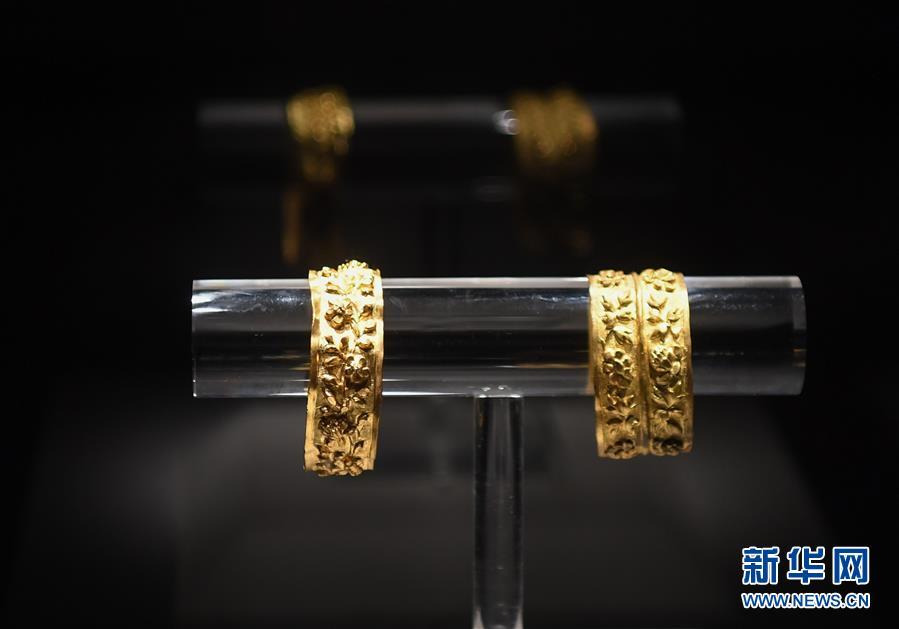 这是在广东阳江海陵岛的广东海上丝绸之路博物馆展出的“南海I号”出土文物金钳镯(5月12日摄)。新华社记者 邓华 摄
