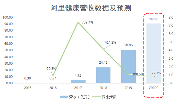 回顾2019年财年,阿里健康营收同比增长108.6%至50.96亿元,连续三个财年营收增速保持在三位数以上,净亏损0.92亿元,经调整净利润为1.22亿元,同比扭亏。