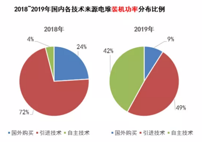 以电池系统的关键部分电堆为例,国产电堆已经大批量应用在整车之上。按装机功率计算,国内电堆使用自主技术的比例已从2018年的4%上升到2019年的42%。