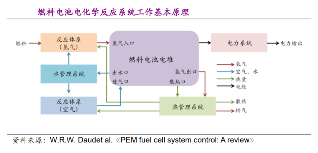 电池系统里,电堆是发生电化学反应的核心部分,“电堆”的含义,即是多个堆叠组合的单体电池。目前主流采用质子交换膜技术,原理可以在“高中化学必修二”中找寻。理科生应该还有些模糊的印象:氧化还原反应、正负电极、电子得失、2H?+O?=2H?O。