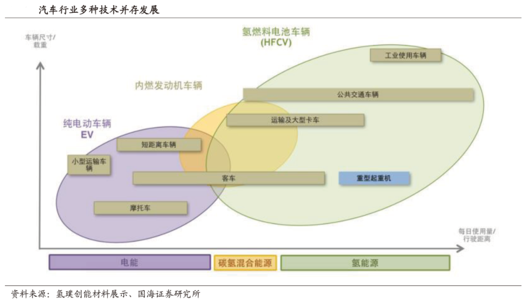 以传统汽车为参照系,载重量越小,行驶里程越短,纯电动汽车越占优;反之,氢燃料电池汽车更占优。氢能在客车、公交车、卡车、物流车、工程车辆等商用车上的应用是一大行业趋势,而重型卡车尤其是35吨以上,则前景尤其广阔,发展潜力巨大。