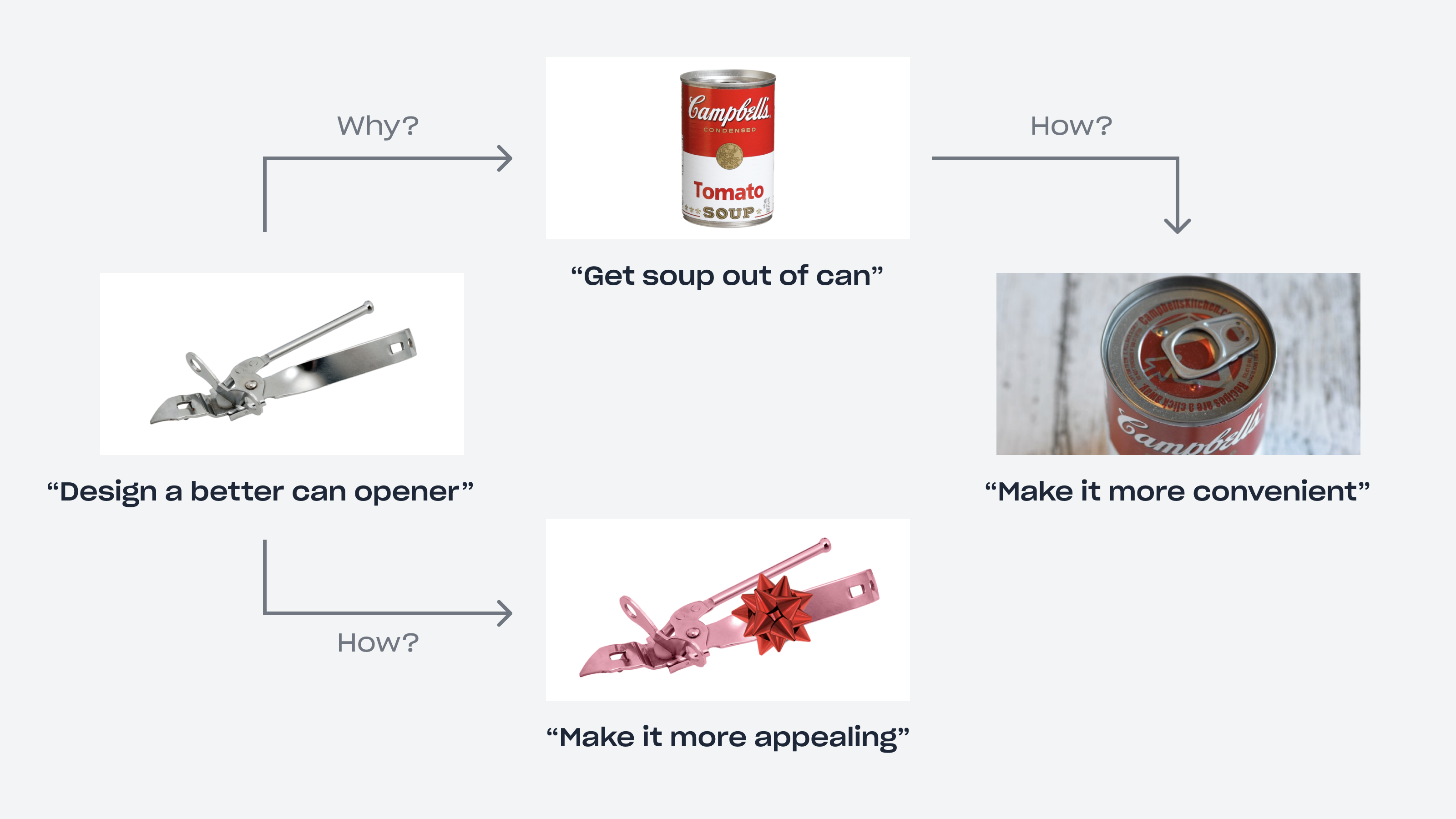 通过这个问题,他找到了更抽象的问题陈述:“吃罐头里的食物”。基于此,他还可能会问:“如何才能吃到罐头里的食物?”通过这个问题,让他找到了不同的问题陈述:“应该做到更加方便。”