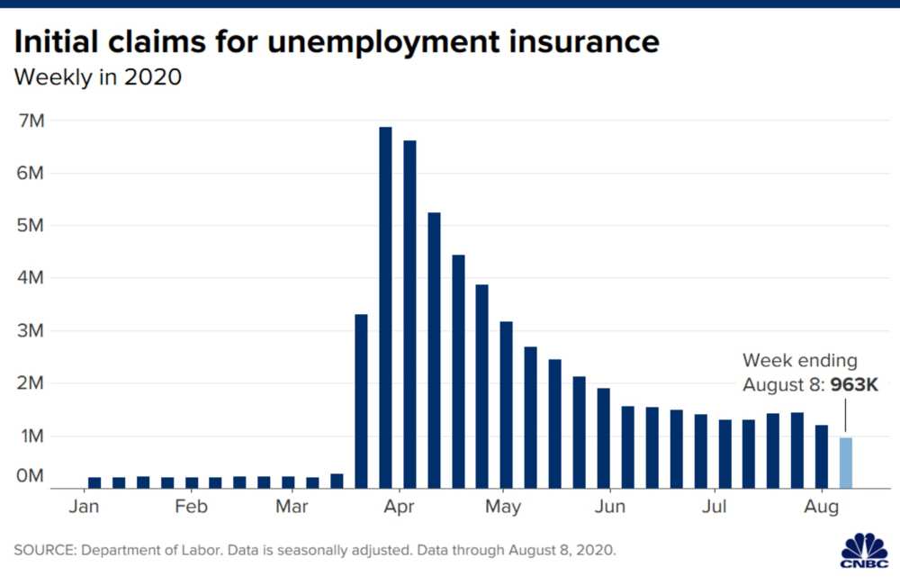上周美国首次申请失业救济人数自3月份大流行病爆发以来首次低于100万人,表明随着冠状病毒传播放缓,经济复苏的动力增强。