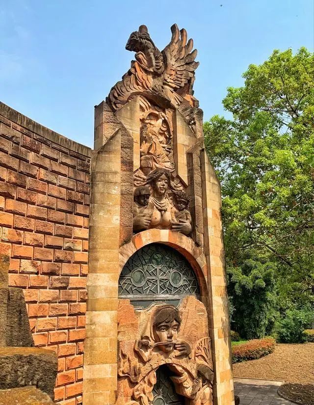 公园里的石刻雕塑建筑,也早已与园内的绿植融为一体。石雕缝隙中顽强生长出来的绿植,不得不赞叹其生命力,绿色与土黄色的石雕相互映衬,为其增色不少。