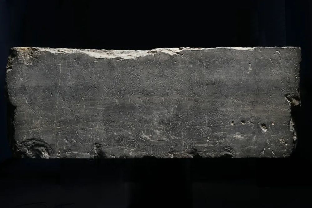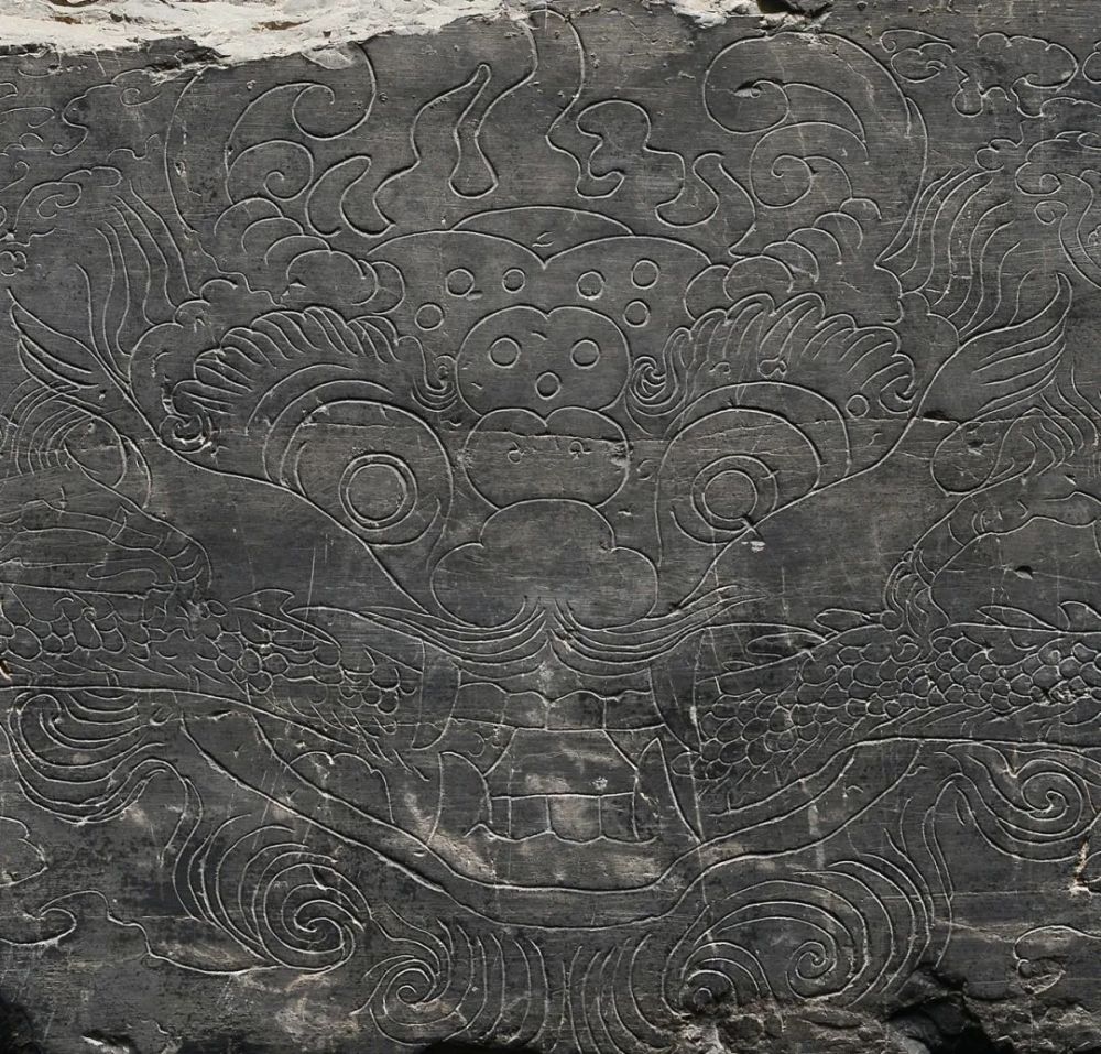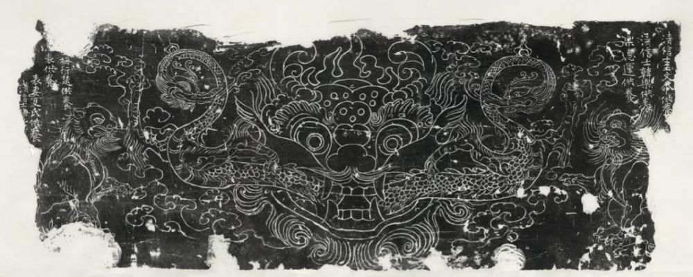 画面中间为一巨大兽首,双角内卷,粗眉毛上扬,大如意形鼻,鼻下八字胡须外撇,龇牙咧嘴,上下各露一对尖锐獠牙,鬃须四扬,大嘴内两侧各腾飞出一巨龙,卷颈回首,巨目长嘴,吐舌,口呼气雾,上飘成团。长身有麟,前两爪挥舞,双龙相向欲驾云升天。两侧各蹲一狮,竖耳,粗眉大眼,宽鼻咧嘴,鬃须怒冲,一前肢抬起,一前肢撑立,后肢曲卧。整幅画面祥云漂浮,表现出瑞兽、巨龙、雄狮在天空各据一方,有压倒一切的气势。左右两端分别刻有供养人名。右端左起:乐息运供养、清信士韩乐供养、清信士王文命供养。左端右起:清信士梅行楚供养、楚息表供养、表妻夏氏供养、清信士梅□□供养。