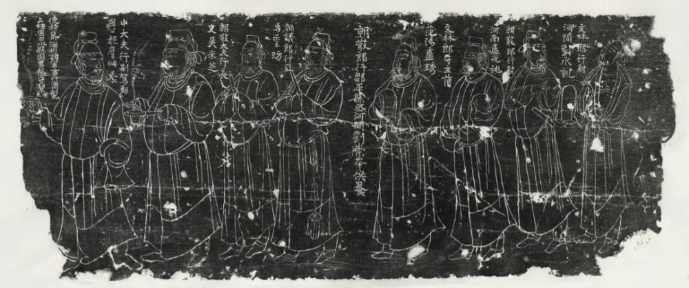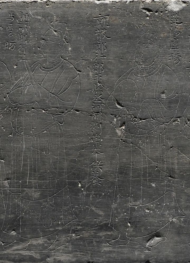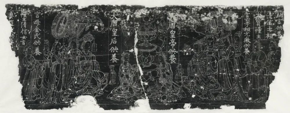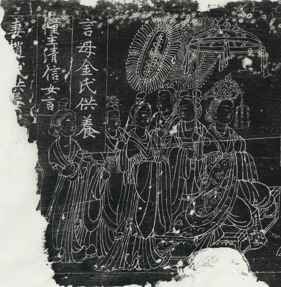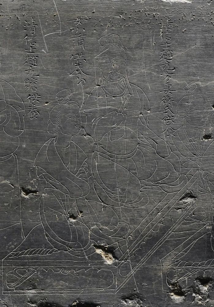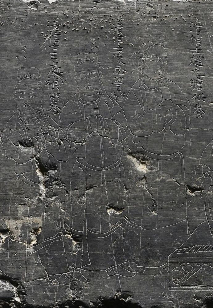 始有二款名:言祖□□乐尚口口獠供养。言弟讷言供养。前榻上跪一男一女,二人为夫妇。男戴幞头,留胡,面向前,身着圆领长袖长袍,腰系带,恭敬跪坐,双手合十于胸前。款名:故人赵元哲供养。女留抛家髻,面向前,身着窄袖短衬,下着长裙,肩搭长巾,长巾一端裹拱手,恭敬跪坐。款名:哲妻李氏程氏供养。后榻跪一男一女,男戴幞头,身着圆领长袖长袍,腰系带,跪在后榻一侧,一手置胸前,一手置腿上。榻上另一侧跪有一女,穿着发型跪式与前榻跪女相同。款名:清信士赵元方妻衡氏供养。后榻左侧跪一女,与前榻跪女穿着发型、跪式相同。款名:女小蒲供养。后榻后立三人均为男性,戴幞头,身着圆领长袍长袖,腰系带,脚蹬靴,双手在袖内拱于胸前,站立一排,仅左边一位留胡须。款名:清信士赵元赡供养、清信士陵思□供养、清信士王处祯供养。三男后立有三女,头均留抛家髻,身着长袖短衫,下着长裙,肩搭长巾,其一将肩搭长巾置拱手前垂下,其二将肩搭长巾一端裹拱手。三女款名:赡妻张氏供养时、□妻桓氏国氏供养、祯妻桓氏供养、贾思赟妻赵氏供养赟息建通妻李氏供养、通息武归妻张氏通息长安息□□□……