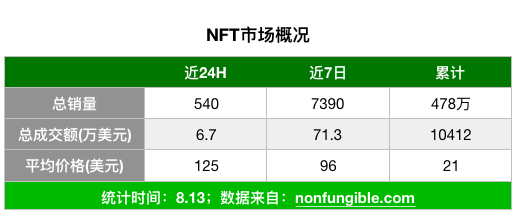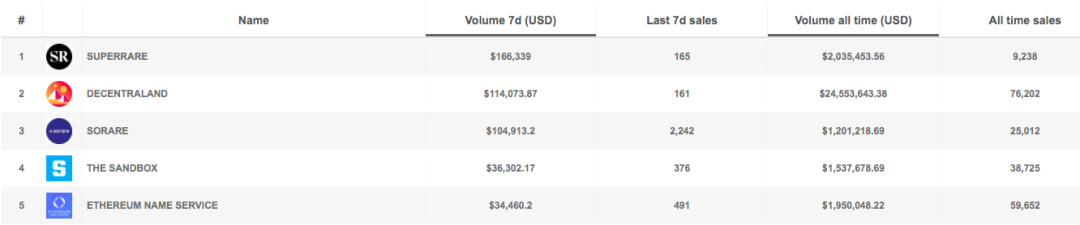 其中,Decentraland 和 The Sandbox 因为受二级市场热捧,近 7 日成交额有 50%、150% 不等的拉升,Ethereum Name Service 的成交额也有 170% 的涨幅。