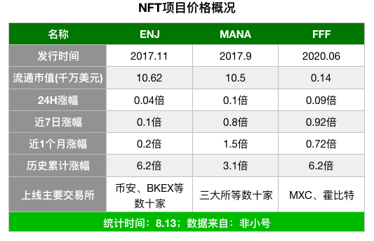 因而,能上线大众化交易所的基本只有小部分带 ERC-20 代币玩法的特殊游戏,譬如接下来要展开的三款排名靠前的代币,ENJ、MANA 和 FFF。