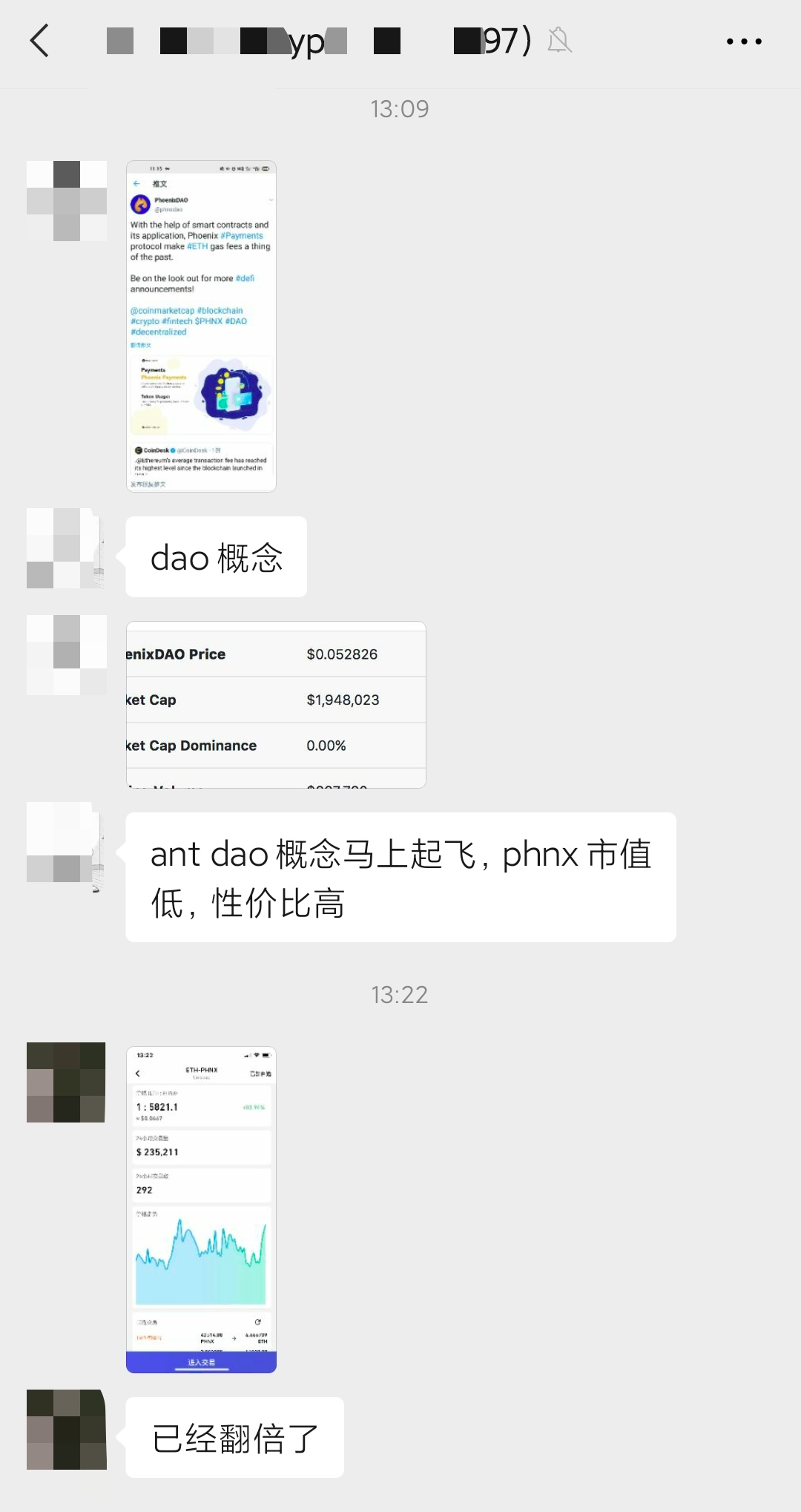 包括我们在上面提到的概念和项目,想借此炒作的大有人在。如下面这两位在群里借“DAO 概念”配合喊单的,各位看官谨慎进场。