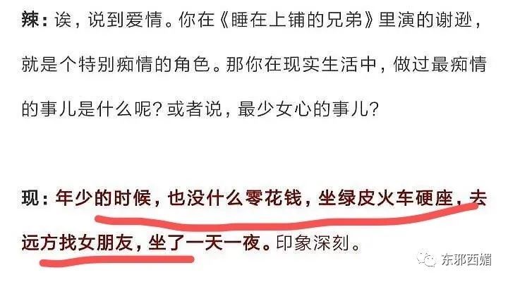 李现曾经在采访中说,做过最痴情的事情,就是年少的时候坐绿皮火车硬座,去远方找女朋友,坐了一天一夜。