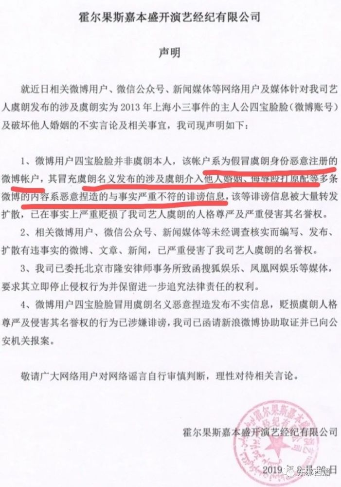 沸沸扬扬中,虞朗的经纪公司出了一纸声明,称四宝脸脸这个帐户是假冒虞朗身份恶意注册的,上面发布的介入他人婚姻、侮辱殴打原配等内容都是恶意捏造的。