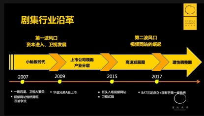 到了2009年,华谊兄弟在A股上市,这是影视第一股,接下来资本就进入行业分层,之后的几年,视频网站开始洗牌,一直到2015年,几大巨头纷纷入场,并在此后的几年迎来了行业的第二波风口,这主要是因为视频网站的崛起,一直到2017年,呈现出BAT三足鼎立加国有芒果一枝独秀的“3+1”竞争格局。与此同时,剧集的主要消费场景逐渐迁移到视频网站。2018年中,行业的泡沫开始挤出,回归到一个理性调整期。