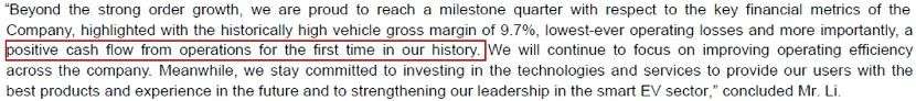 本季度,蔚来汽车综合毛利率为8.4%,而去年同期和上个季度综合毛利率则分别为-33.4%和-12.2%;公司整车销售毛利率达到历史最高的9.7%,而去年同期和上个季度分别为-24.1%和-7.4%。