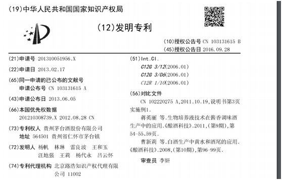 图6:茅台 “一种酱香型调味酒生产工艺”发明专利。来源:国家知识产权局