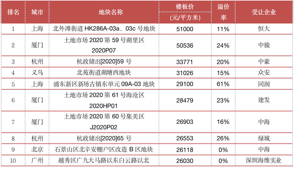 具体来看,单价最高地块为上海北外滩核心区的稀缺含宅地块,土地价值极高,最终由恒大以51000元/平方米的价格竞得,溢价率11%;门槛地块位于广州越秀区,平均楼板价为26030元/平方米。