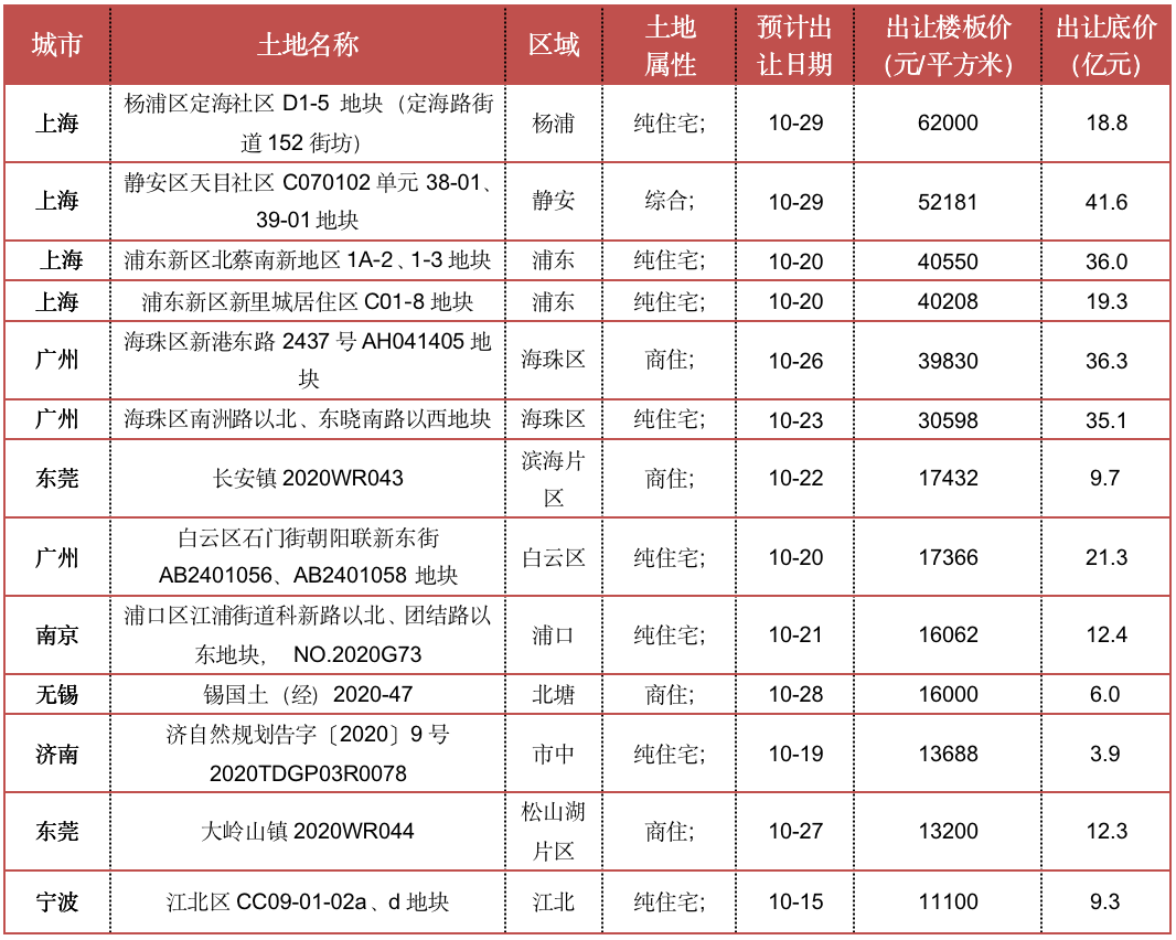 上海、东莞、重庆、成都、杭州、无锡、济南也有多宗优质地块值得关注。上海优质地块供应幅数达到了8宗,杨浦东外滩、静安天目社区两地块起拍楼板价均超5万元/平方米,尤其是东外滩的定海社区D1-5地块起拍楼板价高达6.2万元/平方米,已经接近7月份龙光竞得的一街之隔的土地的成交价65440元/平方米,除此之外,浦东北蔡、三林板块也有优质旧改地块出让,起拍价均在4万元/平方米以上。