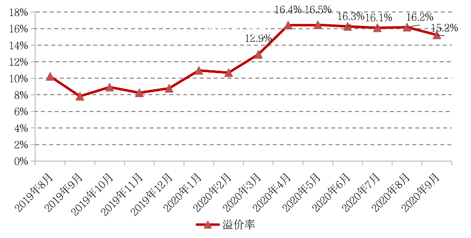 CRIC监测数据显示,9月的溢价率环比8月下降1个百分点,降至15.2%,并创下今年4月以来新低。