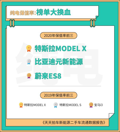 《报告》显示,比亚迪元和蔚来ES8进入今年1-10月纯电动车保值率排行榜前三,仅次于特斯拉Model X。2019年纯电动车保值率前三分别为Model X、Model S和宝马i3。
