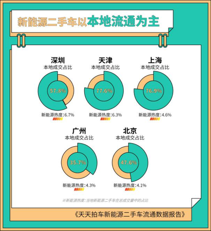 在新能源二手车流通方面,本地化、区域化的交易是主要的流通方式。整体来看,本地成交的新能源二手车在天天拍车平台的占比为63%,大部分的新能源二手车被本地买家买走。其中,深圳的本地成交占比为57.8%、天津为77.6%、上海为76.9%。