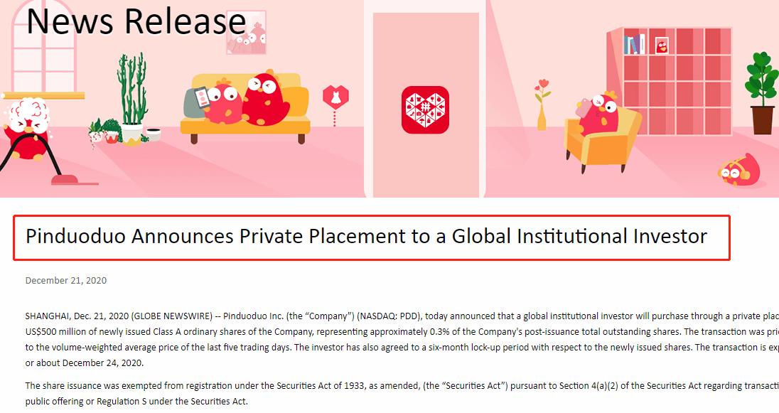 拼多多宣布向一名全球机构投资者定向增发价值近5亿美元的新发行A类普通股。