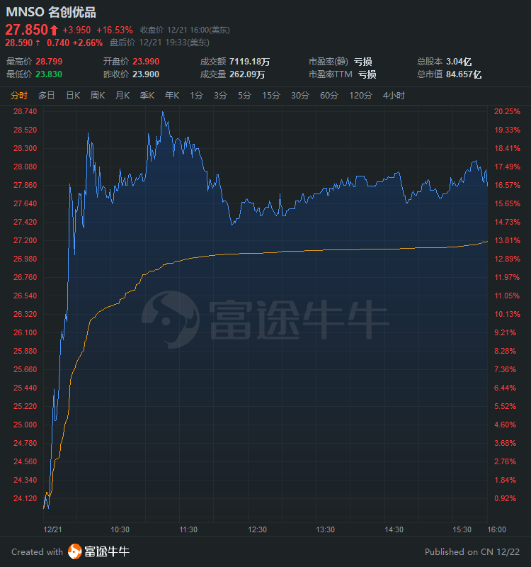 名创优品股价周一再创新高,截止收盘涨16.53%报27.85美元,盘中股价一度涨至28.799美元。