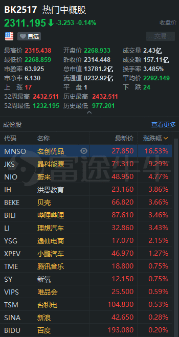 知名中概股中:阿里巴巴涨0.17%;百度涨0.2%;京东跌1.09%;网易跌1.96%;拼多多跌1.67%;蔚来涨4.77%;小鹏汽车跌1.27%;理想汽车涨3.43%;爱奇艺跌1.28%;哔哩哔哩涨3.46%,创历史新高。