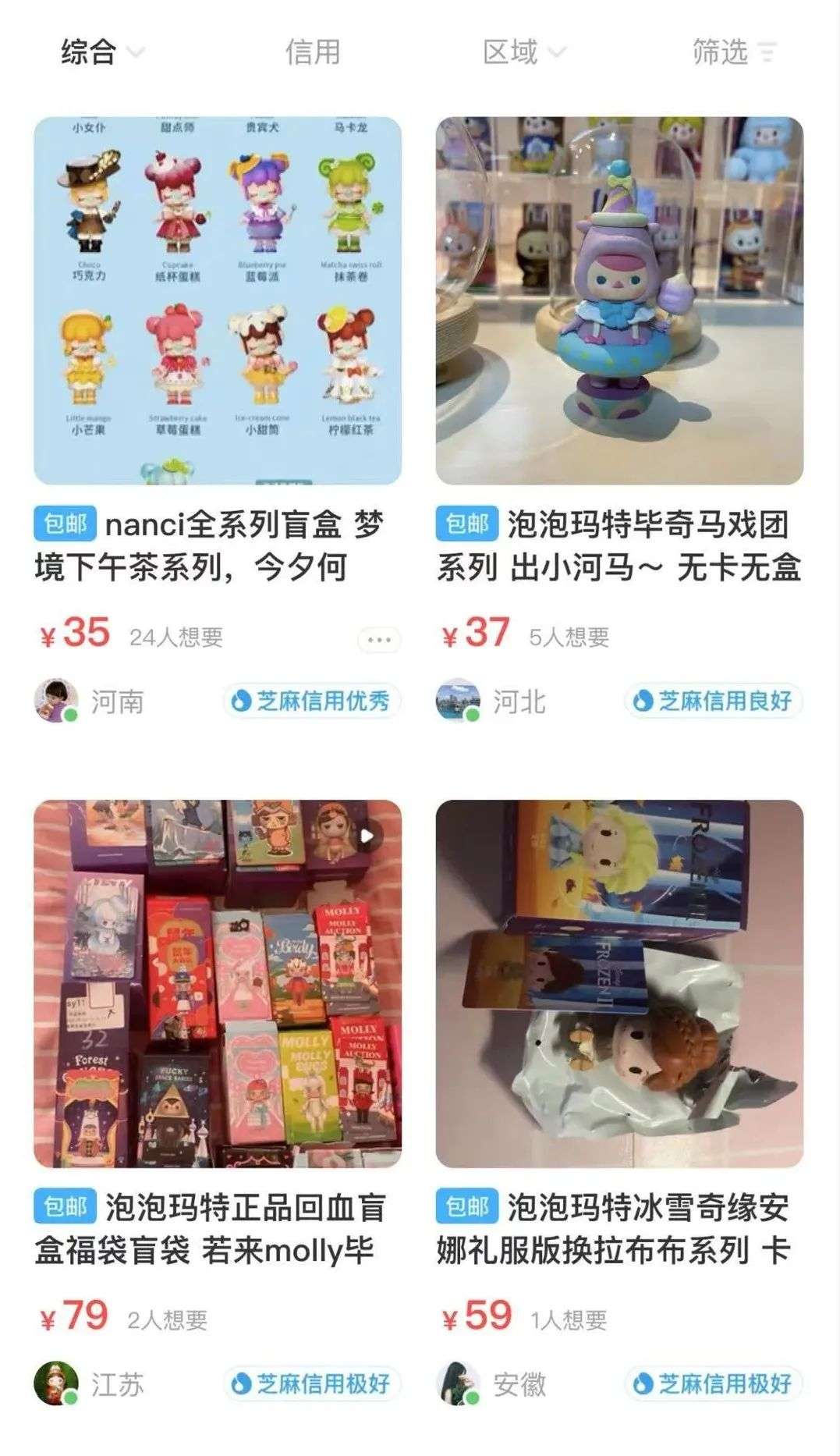 从入坑到现在,大概买了几百个娃娃,其实大部分盲盒到手就跌价,什么价值也没有,后来才发现,闲鱼、潮玩族小程序上有二手娃娃买卖,上面的泡泡玛特玩具分为两种,要么就是加价的隐藏款,要么就巨便宜的普通款。