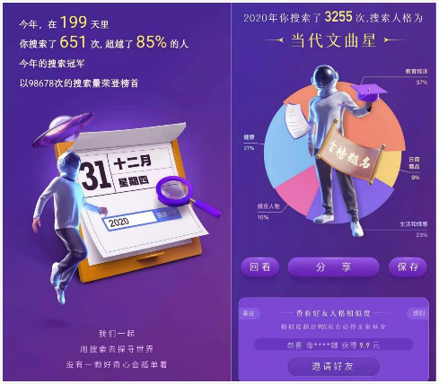 第三类通过对用户数据和行为的综合分析,给出关键词为用户画像进行分类和标识,一般出现在年终盘点项目的尾声。百度《答案2020》就根据用户搜索内容的比重不同,划分搜索人格,像是“当代文曲星”、“长寿村村长”、 “秋名山车神”等等标签,并通过人格相似度获取亲密基金等衍生活动增强用户分享。