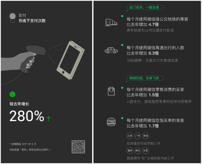 第四类产品成果总结报告,可以看做是企业对于行业和用户发出的信号。除了像此前提到的,2017年《微信数据报告》中,移动支付只包含“月社交支付次数”和“月线下支付次数”,而在2018年报告中,这一部分被整合成为“智慧生活数据”,其背后暗藏着团队业务变革的野望。