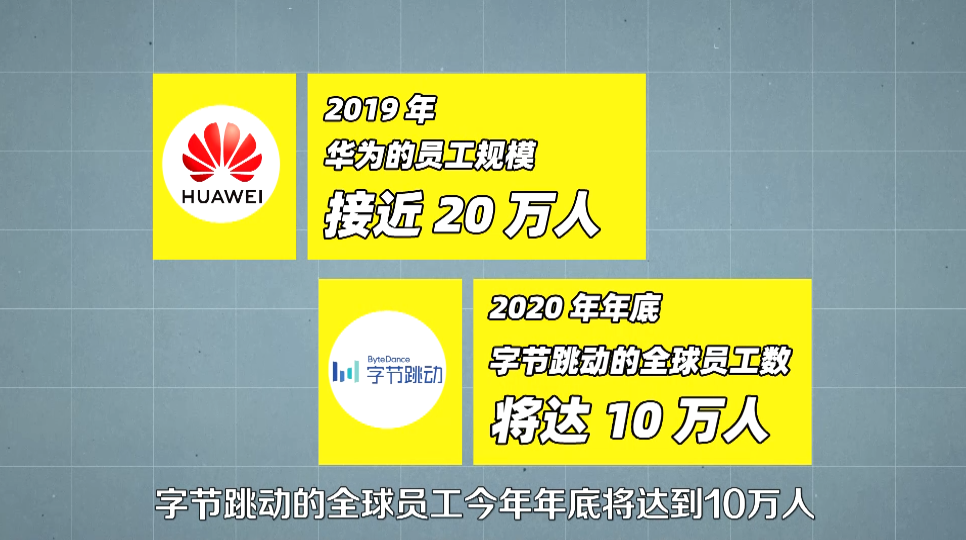华为的员工规模在2019年就已经接近20万人, 字节跳动的全球员工今年年底将达到10万人。