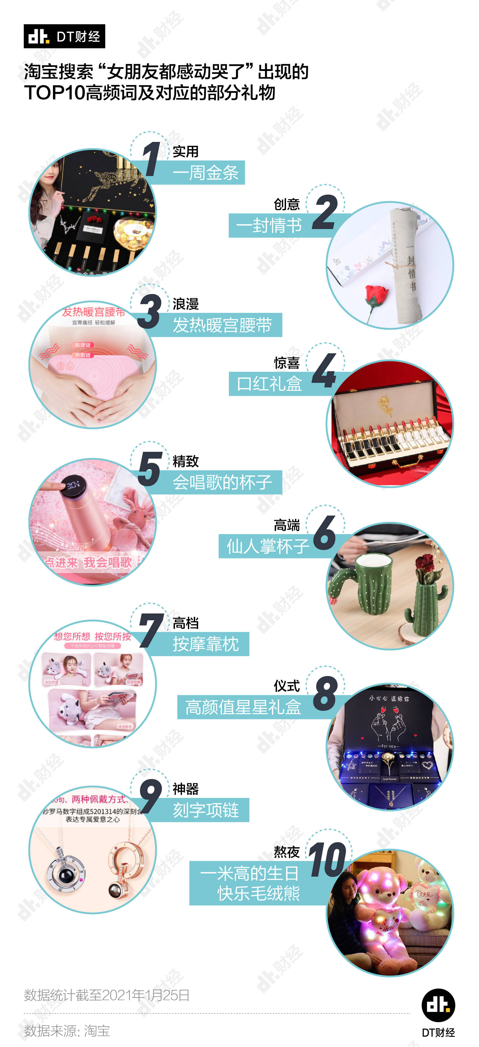 那屏幕另一头的淘宝卖家们,都给这些痴情男子提供了哪些选项呢?从结果来看,淘宝上那些能够自信把女友感动哭的礼物中,销量最好的前2000件大多是以「实用」「浪漫」和「高端」自居的商品。