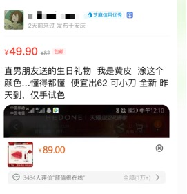 第二个,「懂的都懂」。「一位直男朋友送的生日礼物,我是黄皮,涂这个颜色,懂的都懂」。这是一位来自安徽安庆的女卖家,她正在出手一款不太适合黄皮女性的口红。