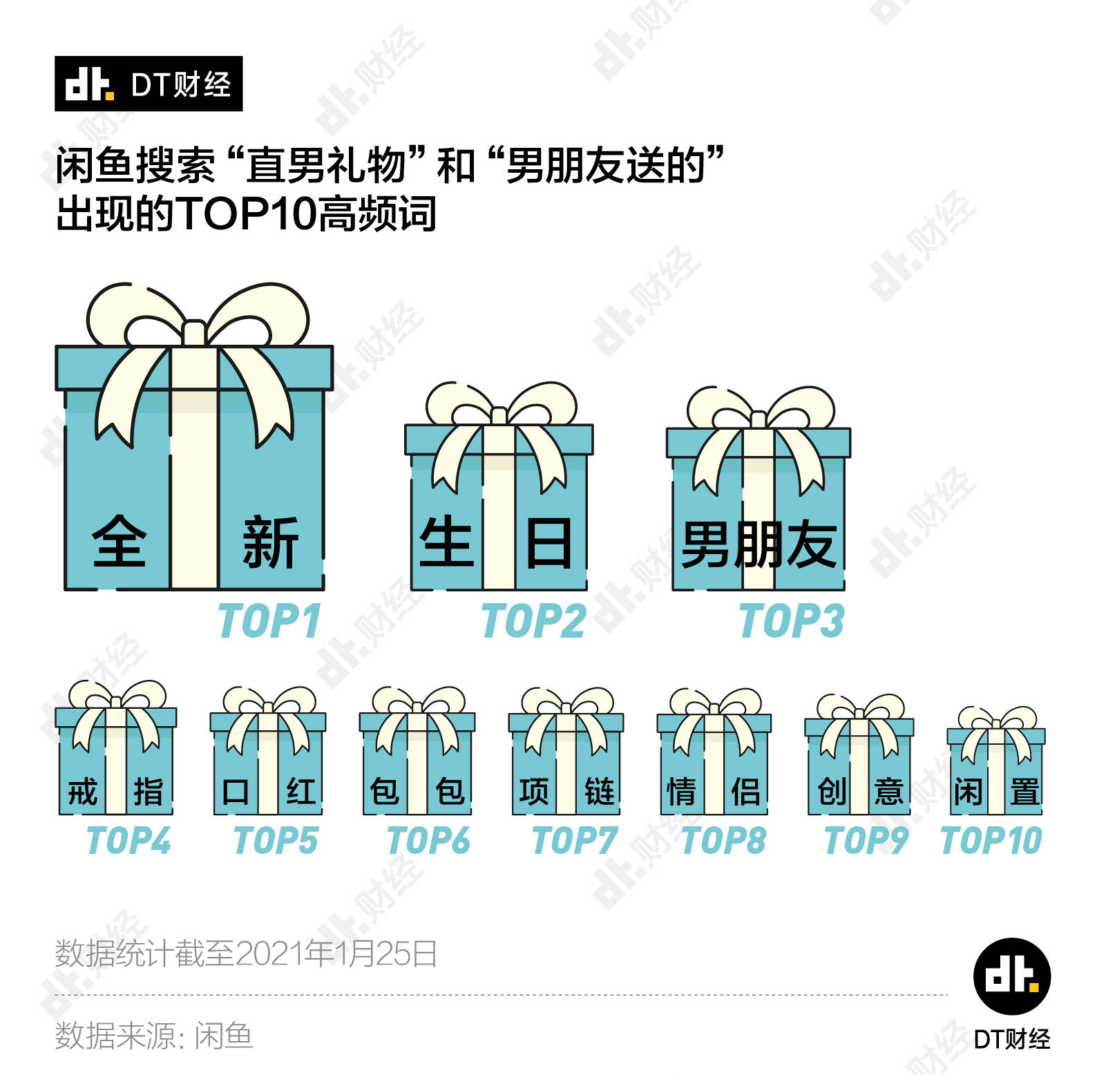 在闲鱼搜索关键词「男朋友送的」「男友送的」,我们发现姐妹们出手直男赠礼时,通常用「全新」「创意」或「闲置」形容它们。从词频来看,这些礼物大多是「戒指」「口红」等充满了象征意义的礼物。