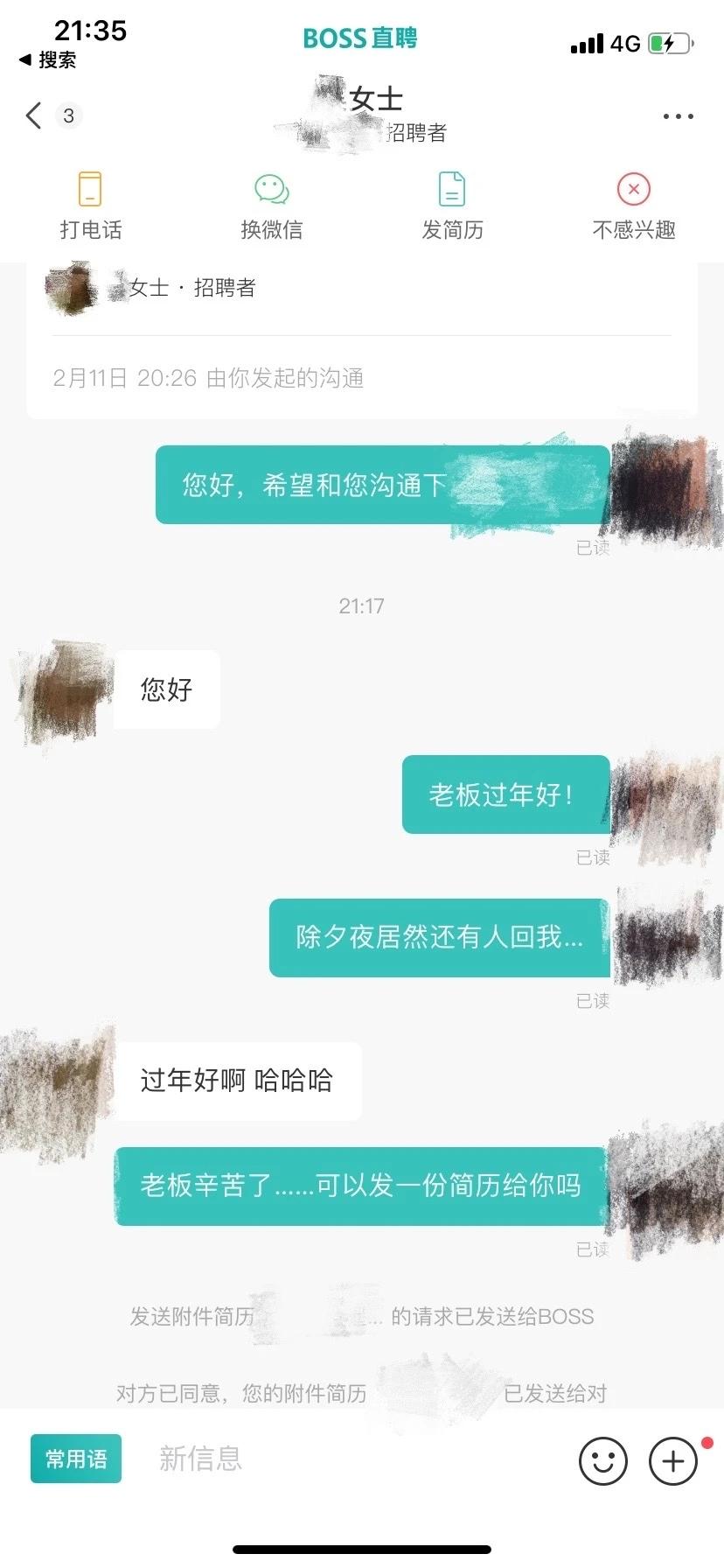 之前看中一家本地互联网公司的销售岗,老板在除夕这天回我,我就赶紧跟他聊了几句。