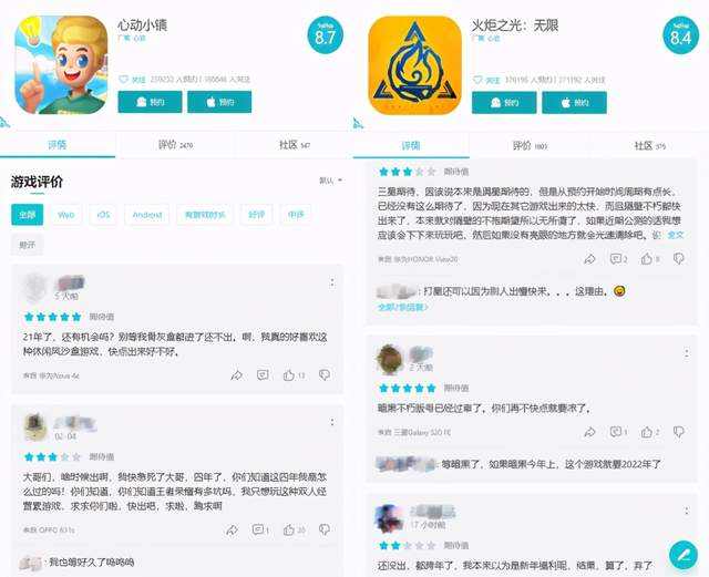 然而至2021年2月,我们在TapTap平台搜索《火炬之光:无限》和《心动小镇》,发现这两款产品仍处于用户预约阶段,没有可供玩家体验的版本。翻到评价页,这两款手游的近期用户评价也都是非常一致的催促声音。