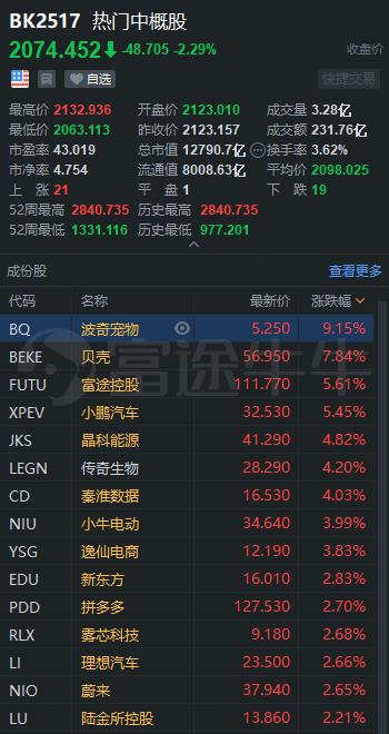 富途热门中概股板块个股涨跌互现,其中共21只股票上涨,19只股票下跌,1只股票收平。