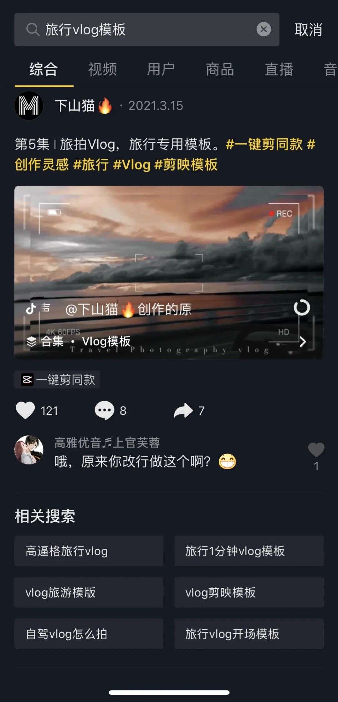 开菠萝财经发现,在短视频平台上,不仅有许多博主分享视频拍摄教程、旅行Vlog片头、背景配乐等,甚至还有现成的视频模板可以直接套用。比如,在抖音搜索“旅行Vlog模板”,显示的视频下方即有“一键剪同款”功能,点击即可跳转至剪映APP进行同款创作。