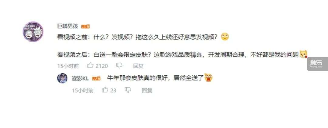 还有一个有趣的现象,在开发者日志发布后,出现了一些非常有趣的评论,比如:“发生了啥?我只记得都是我的问题。”或者:“看视频之前:什么?发视频?拖这么久上线还好意思发视频?看视频之后:白送一整套限定皮肤?这款游戏品质精良,开发周期合理,不好都是我的问题。”