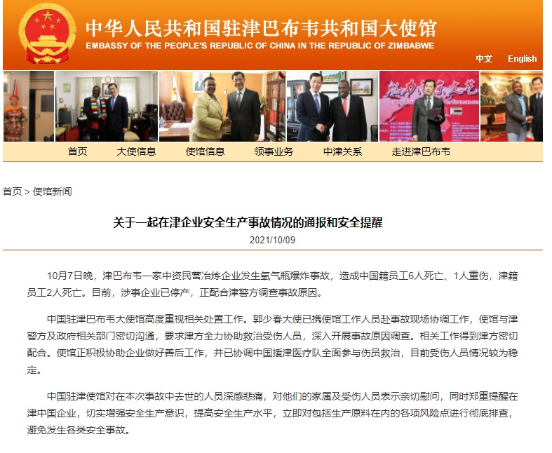 10月7日晚,津巴布韦一家中资民营冶炼企业发生氧气瓶爆炸事故,造成中国籍员工6人死亡、1人重伤,津籍员工2人死亡。目前,涉事企业已停产,正配合津警方调查事故原因。