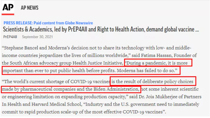 美联社报道援引“健康伙伴组织”和哈佛医学院乔伊亚·穆克吉博士的观点指出,“实际上目前新冠肺炎疫苗短缺是制药公司和拜登政府故意做出的政策选择,而不是因为扩大产能受到某些固有的科学或工程限制”。南非“健康正义倡议”组织创始人法蒂玛·哈桑说:“在疫情大流行期间,将公共卫生置于利润之前比以往任何时候都更重要。而莫德纳未能做到这一点。”