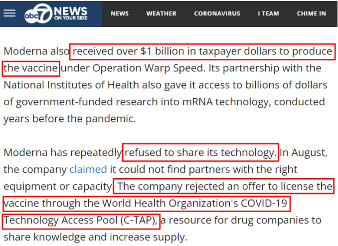 美国广播公司下属WJLA电视台指出,莫德纳的mRNA疫苗被专家认为是最适合在全球分发的疫苗。更重要的是,莫德纳还获得了超过10亿美元的纳税人资金,用于在"曲速行动"下生产疫苗,它与美国国立卫生研究院的合作还使它获得了政府资助的数十亿美元的“mRNA技术”研究成果,但莫德纳公司一再拒绝分享其技术。