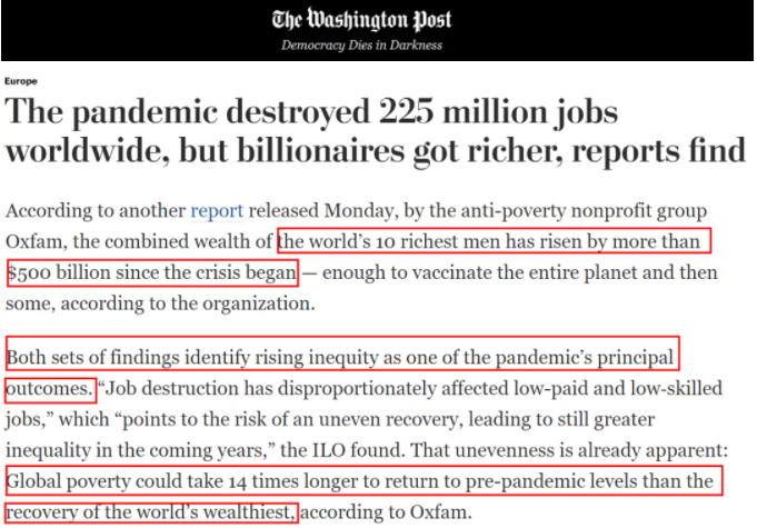 但超级富豪们却看到了自己财富的飙升。《华盛顿邮报》援引了反贫困非营利组织乐施会(Oxfam)发布的另一份报告说,自新冠疫情开始以来,世界上最富有的10人的财富加起来已经增加了5000多亿美元,这些钱足够给全球所有人接种疫苗。而根据《华盛顿邮报》的报道,有关调查结果认为,不平等加剧是疫情大流行的主要结果之一。