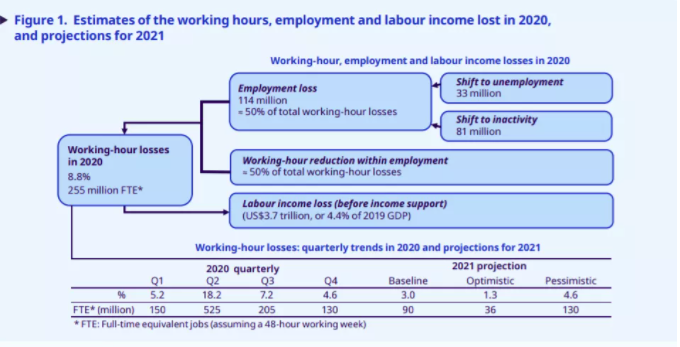 根据国际劳工组织报告,由于新冠疫情大流行,去年全球至少有2.25亿全职工作岗位消失,比2009年全球金融危机损失的四倍还要多。