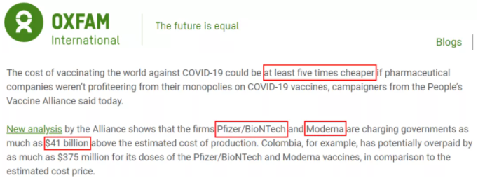 反贫困非营利组织乐施会(Oxfam)官方网站援引人民疫苗联盟分析报告截图。