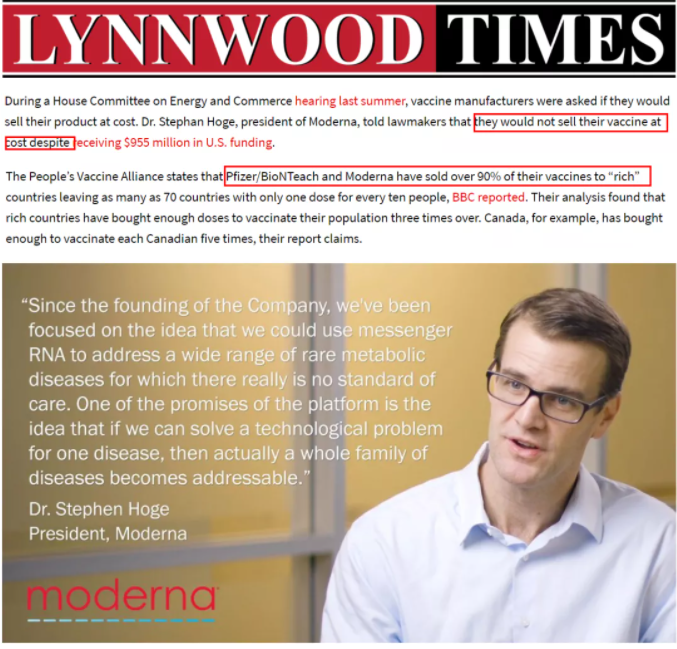 根据《林伍德时报》的报道,美国向这些制药公司提供了20亿美元用于新冠肺炎疫苗的研究。但在2020年夏天众议院能源和商业委员会的听证会上,疫苗制造商被问及是否会按成本价销售产品时,莫德纳公司总裁斯蒂芬·霍格告诉议员们,尽管该公司获得了约10亿美元的政府资助,但他们不会按成本价出售疫苗。