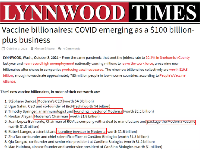 而根据《林伍德时报》的报道,疫苗公司股价的飙升带来了9位新亿万富翁的诞生,其中5人与莫德纳公司有关。 根据“人民疫苗联盟”的数据,新上榜的9位亿万富翁总身价为193亿美元,足以购买供低收入国家约7.8亿人接种的疫苗。