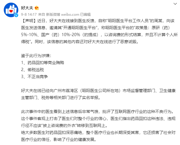 “原研(药)5%-10%、国产(药)10%-20%(的提成),以咨询费的形式结算,并且不计算个人所得税……”9月8日,@好大夫在线 官微发出一则声明,声明指出一名自称“昭阳医生平台工作人员”的周某向其平台下的医生发出“邀请”,向该名医生介绍昭阳医生平台的回扣政策,且对好大夫在线进行了恶意诋毁。