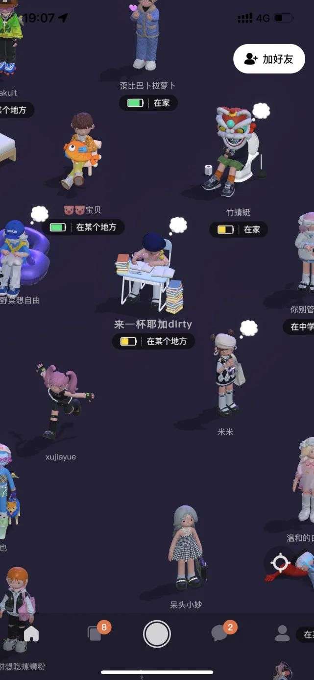 有了好友后,晓梦啫喱App首页便出现了她和所有好友“捏”的3D虚拟人,每个虚拟人附近会出现一些道具,展现他们所设置的状态,比如运动、放空、野性消费等。