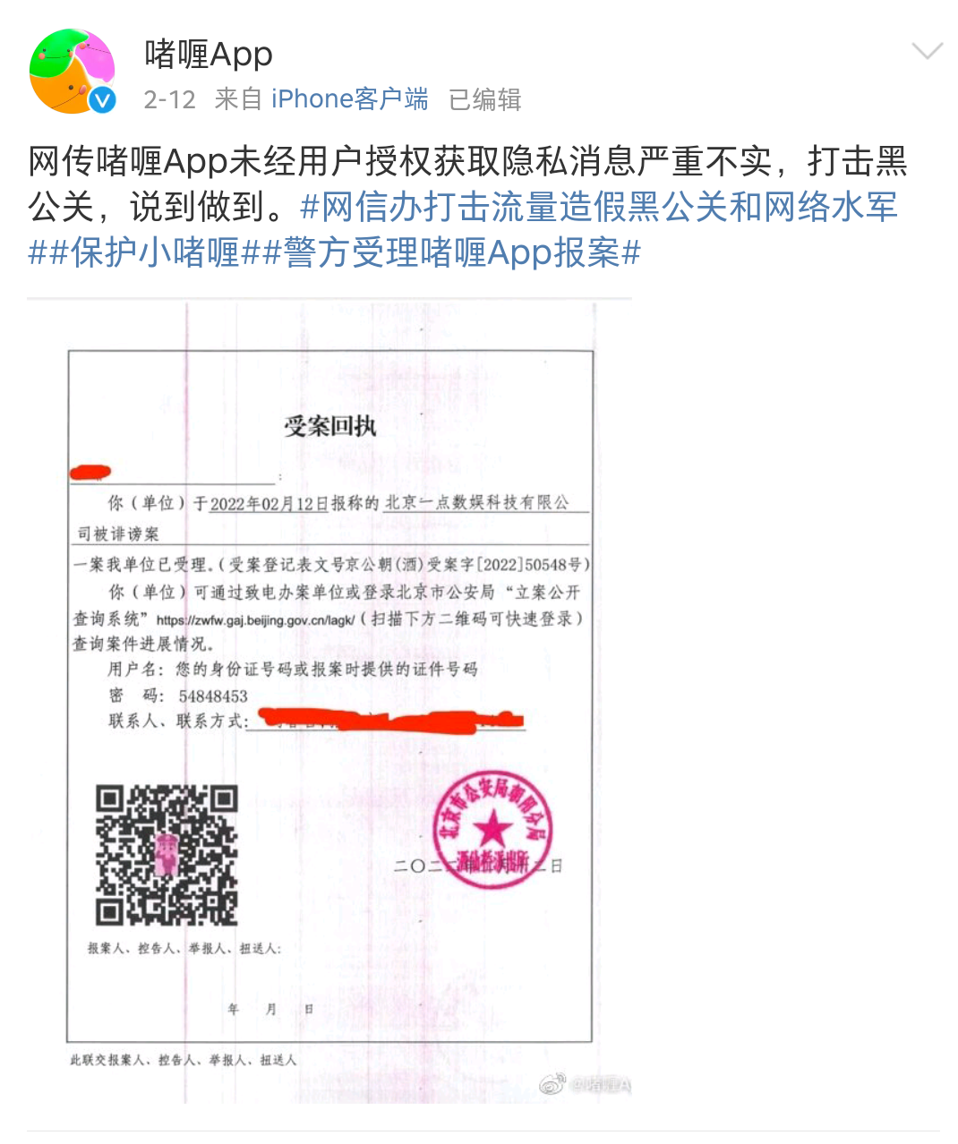 2月12日,啫喱团队发微博澄清,表示未经用户授权获取隐私的消息严重不实,并晒出派出所的受案回执,案由是“被诽谤”。不过截至目前,该团队尚未回应舆论关于抄袭的质疑。